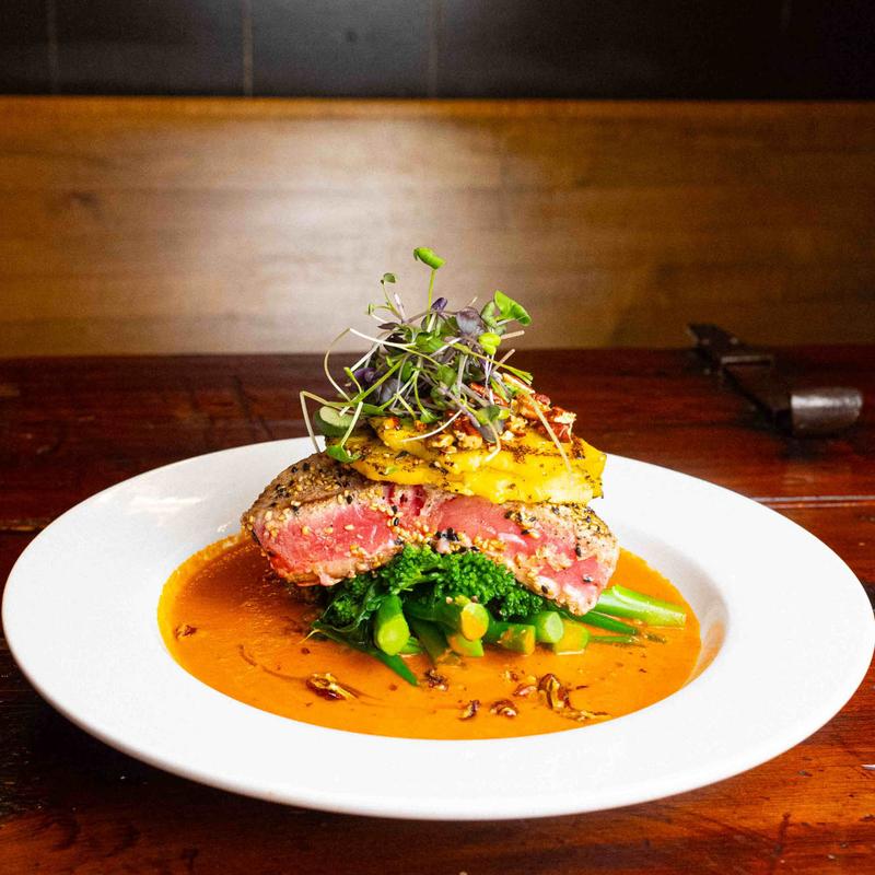 garlic broccolini, red coconut-curry sauce, toasted pecans, grilled pineapple, Meyer lemon oil